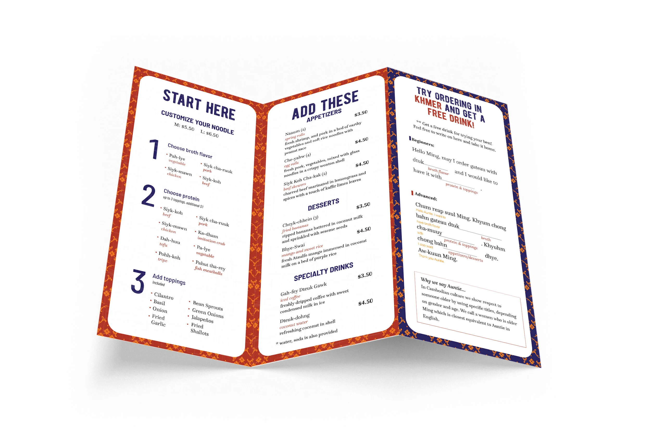 A mad-lib is included on the menu to try to encourage customers to learn Khmer, the Cambodian language.