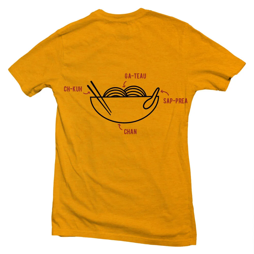 The uniform has an illustration of a bowl of noodles with khmer words written for each item on the shirt. When a workers back is turned, customers are able to read and learn.